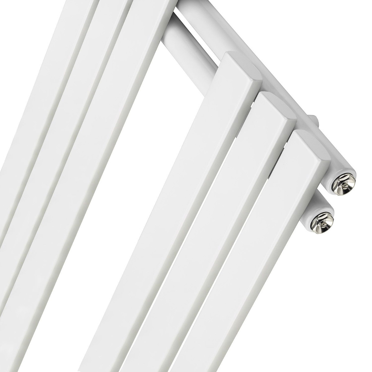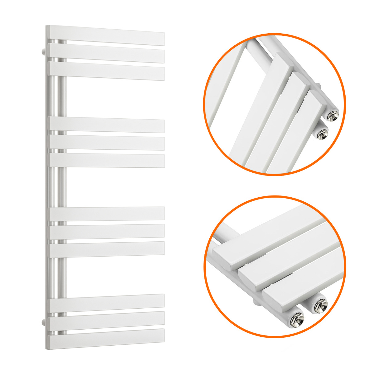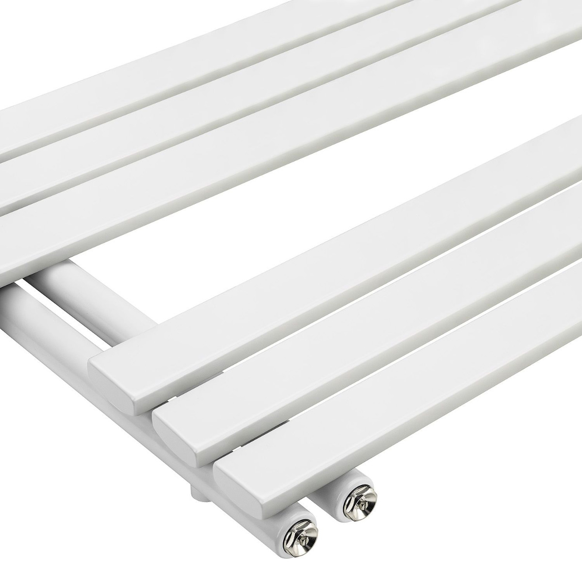 This modern white towel rail has 12 oversized flat panel tubes, the structural bars are both on the same side of the towel rail which creates a unique look and allows you to easily add and remove towels.