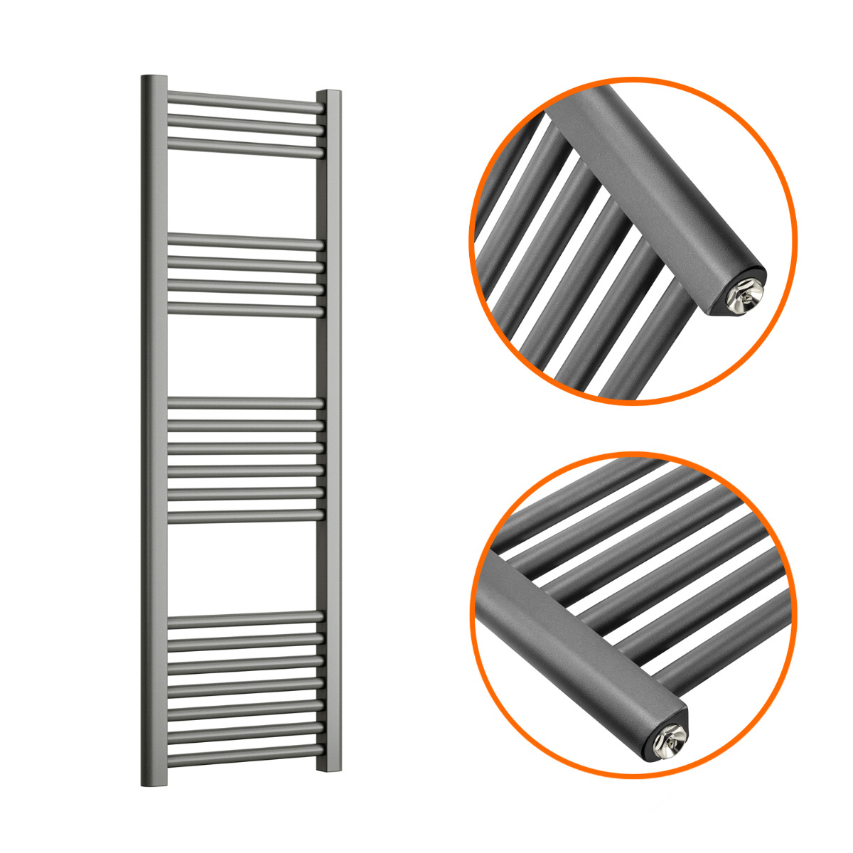 These 1200mm x 400mm anthracite towel rails and an excellent way to enhance the appearance and warmth of your bathroom. The radiators are manufactured to the highest possible standards using premium quality mild steel which ensures reliability and they emit a fantastic heat output of 1074 BTUs.