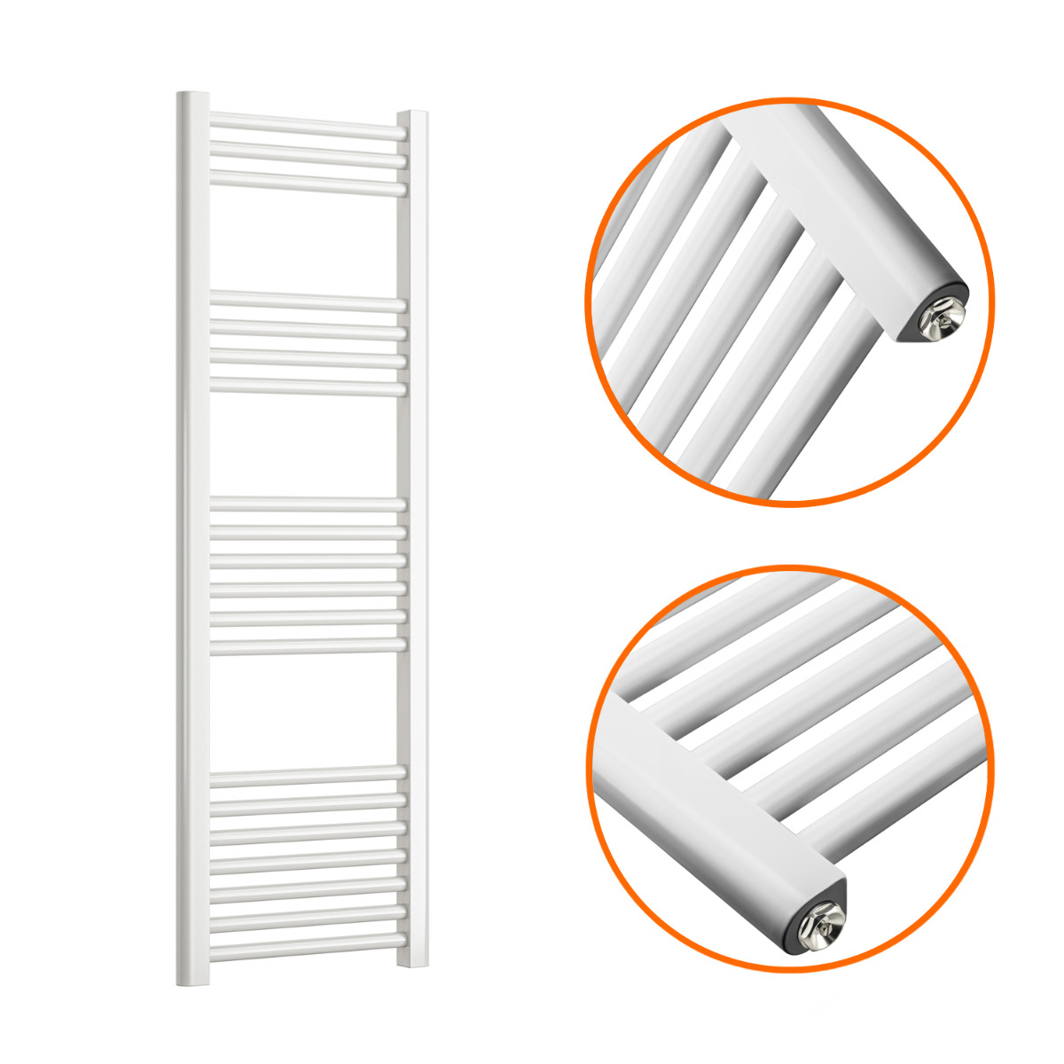 These 1200mm x 400mm glossy white towel rails and an excellent way to enhance the appearance and warmth of your bathroom. The radiators are manufactured to the highest possible standards using premium quality mild steel which ensures reliability and they emit a fantastic heat output of 1074 BTUs.