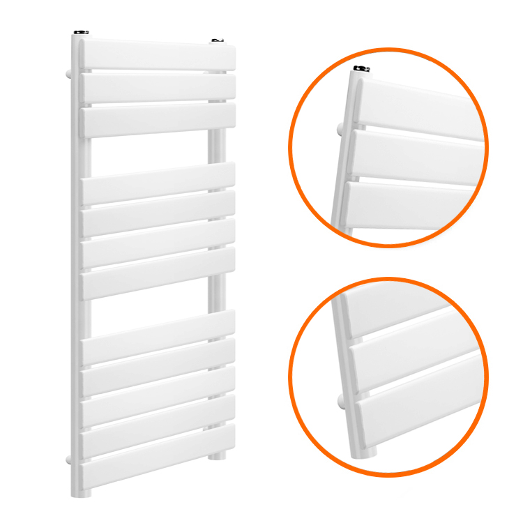 These 1200mm x 600mm white flat panel towel rails and an excellent way to enhance the appearance and warmth of your bathroom. The radiators are manufactured to the highest possible standards using premium quality mild steel which ensures reliability and they emit a fantastic heat output of 1423 BTUs.