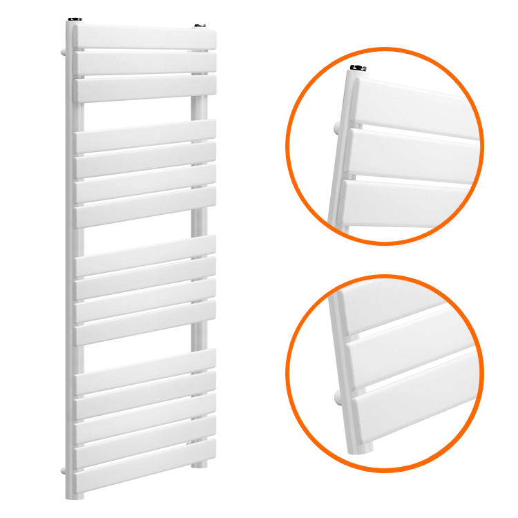 These 1600mm x 600mm white flat panel towel rails and an excellent way to enhance the appearance and warmth of your bathroom. The radiators are manufactured to the highest possible standards using premium quality mild steel which ensures reliability and they emit a fantastic heat output of 1856 BTUs.